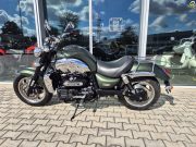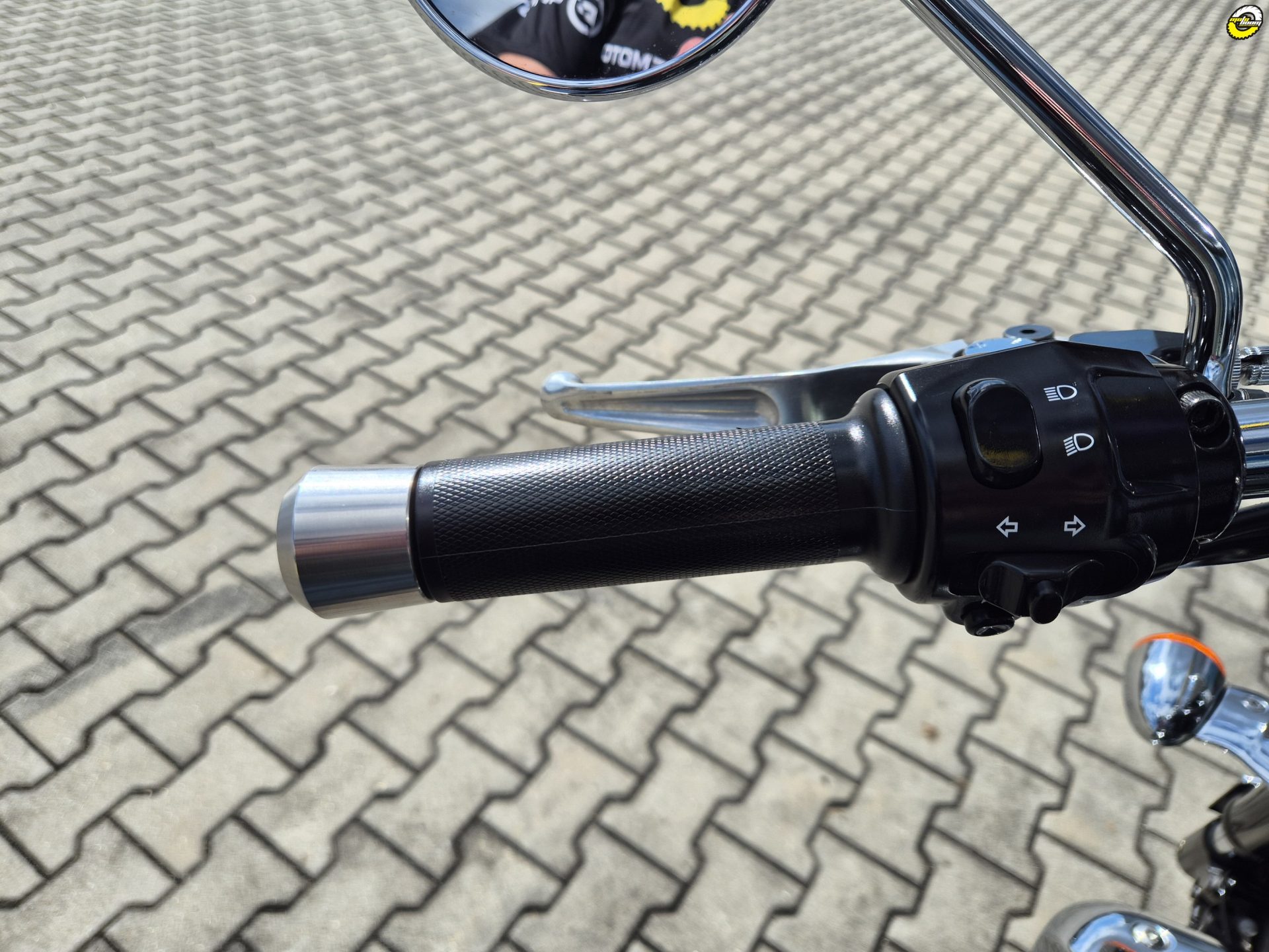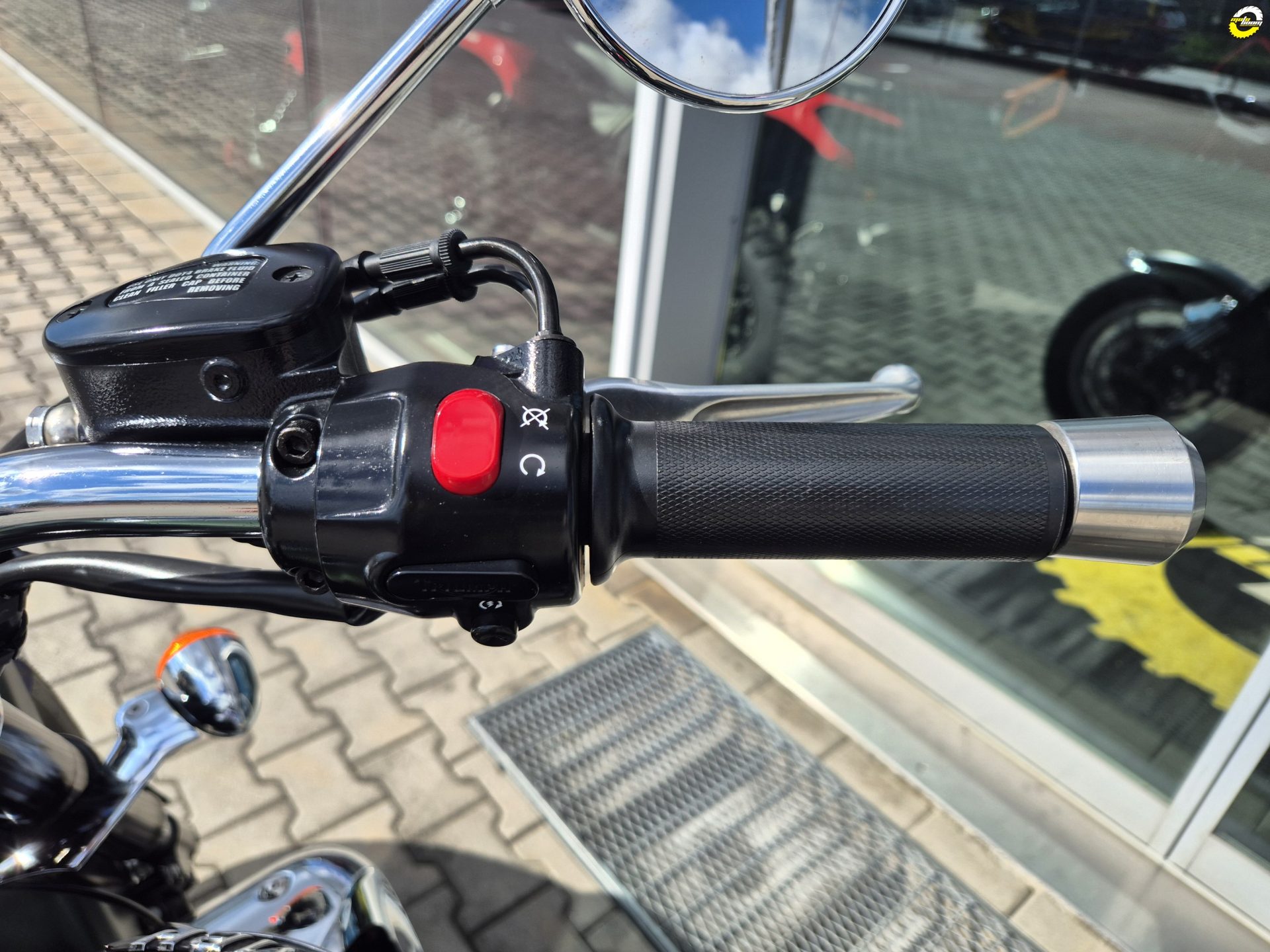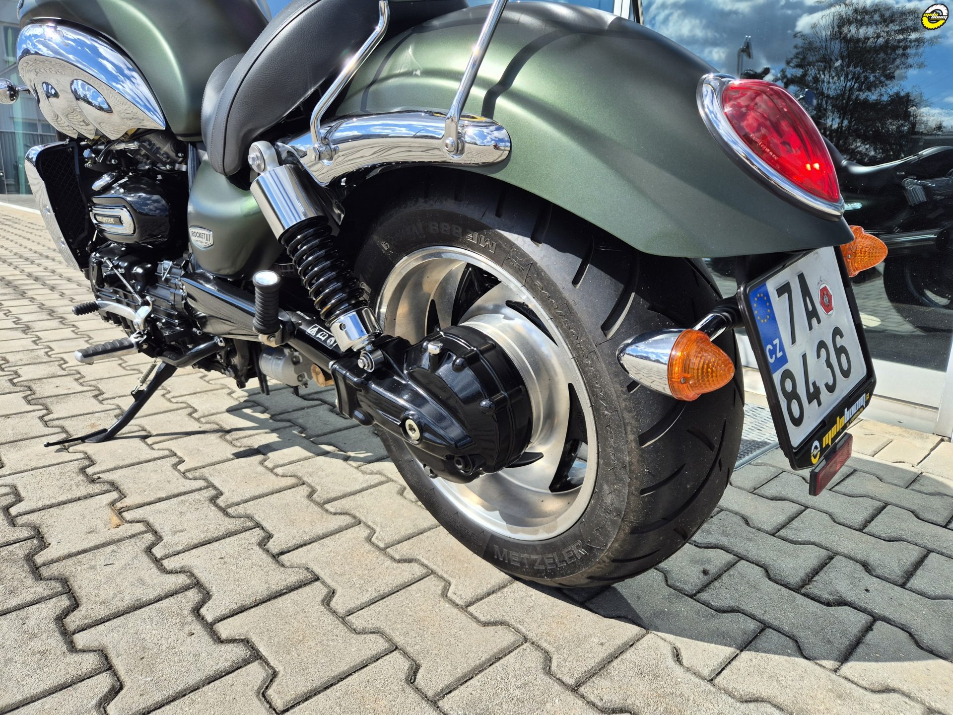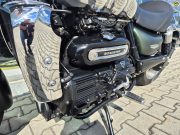 - Motocykl je vybaven laděným výfukem pro hluboký, burácející zvuk a nosičem místo zadního sedadla pro praktičnost.