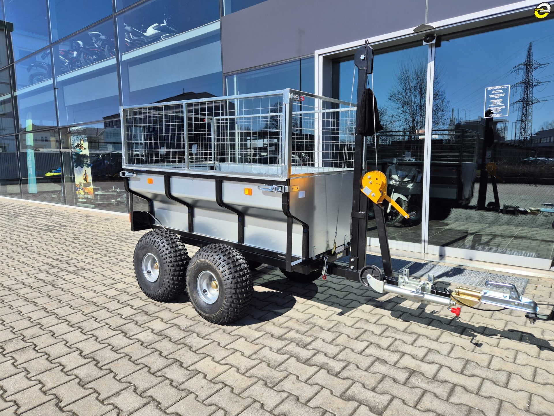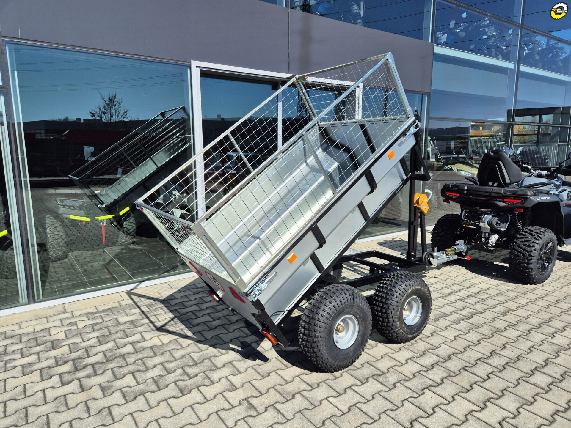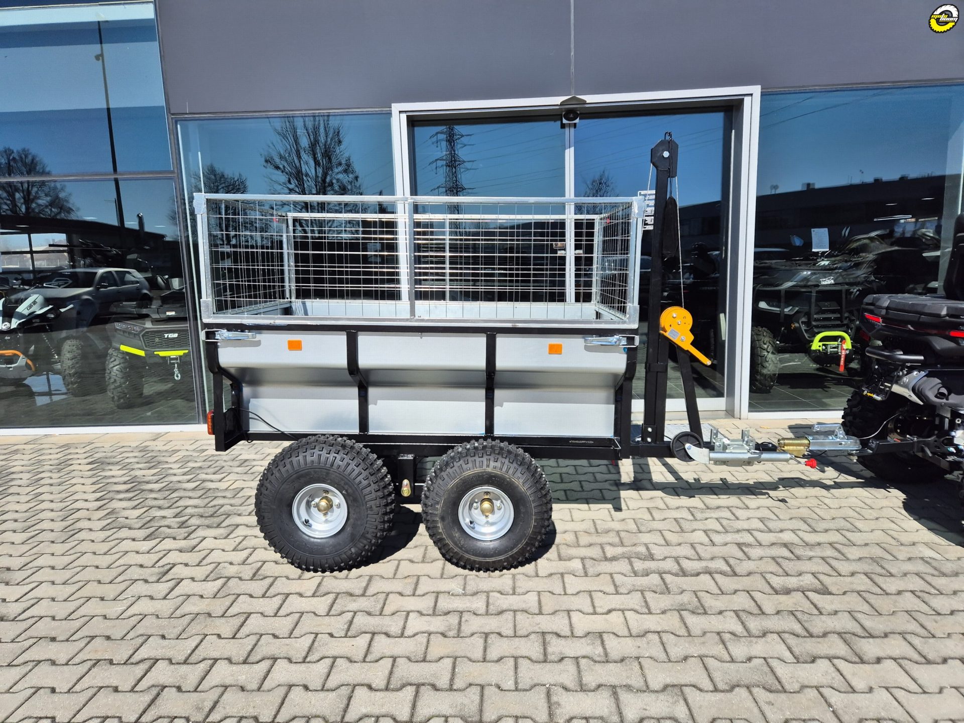 Velkoobjemový dvounápravový vozík se sklopnou ocelovou korbou, zvýšenými bočnicemi a otočnou ojí z řady profesionálního příslušenství QuadKit. Vhodný za čtyřkolku, UTV, SSV i traktůrek pro pracovní nasazení například na farmě, v lese nebo na stavbě. Nosnost dle použitých pneumatik až 1420 kg.