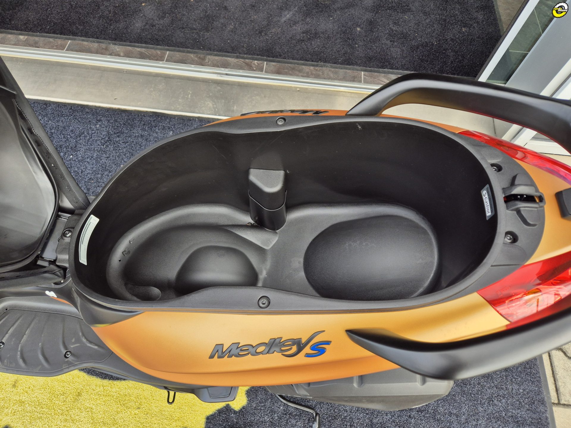 Piaggio Medley S kombinuje sportovní charakter s nejnovějšími technologiemi přímo v ovládacích prvcích - digitálním LCD přístrojovým panelem počínaje. Díky systému Piaggio MIA, který je součástí základní výbavy, budeš vždy ve spojení. Umožňuje aktivovat funkci Bike Finder, spravovat oznámení, poslouchat oblíbené playlisty, sledovat trasu a stav skútru - to vše prostřednictvím mobilní aplikace a ovládacích prvků Bluetooth. Ergonomické sedlo nabízí elektrické otevírání, které aktivuješ přímo z řídítek, díky čemuž je organizace úložného prostoru ještě pohodlnější a inteligentnější.