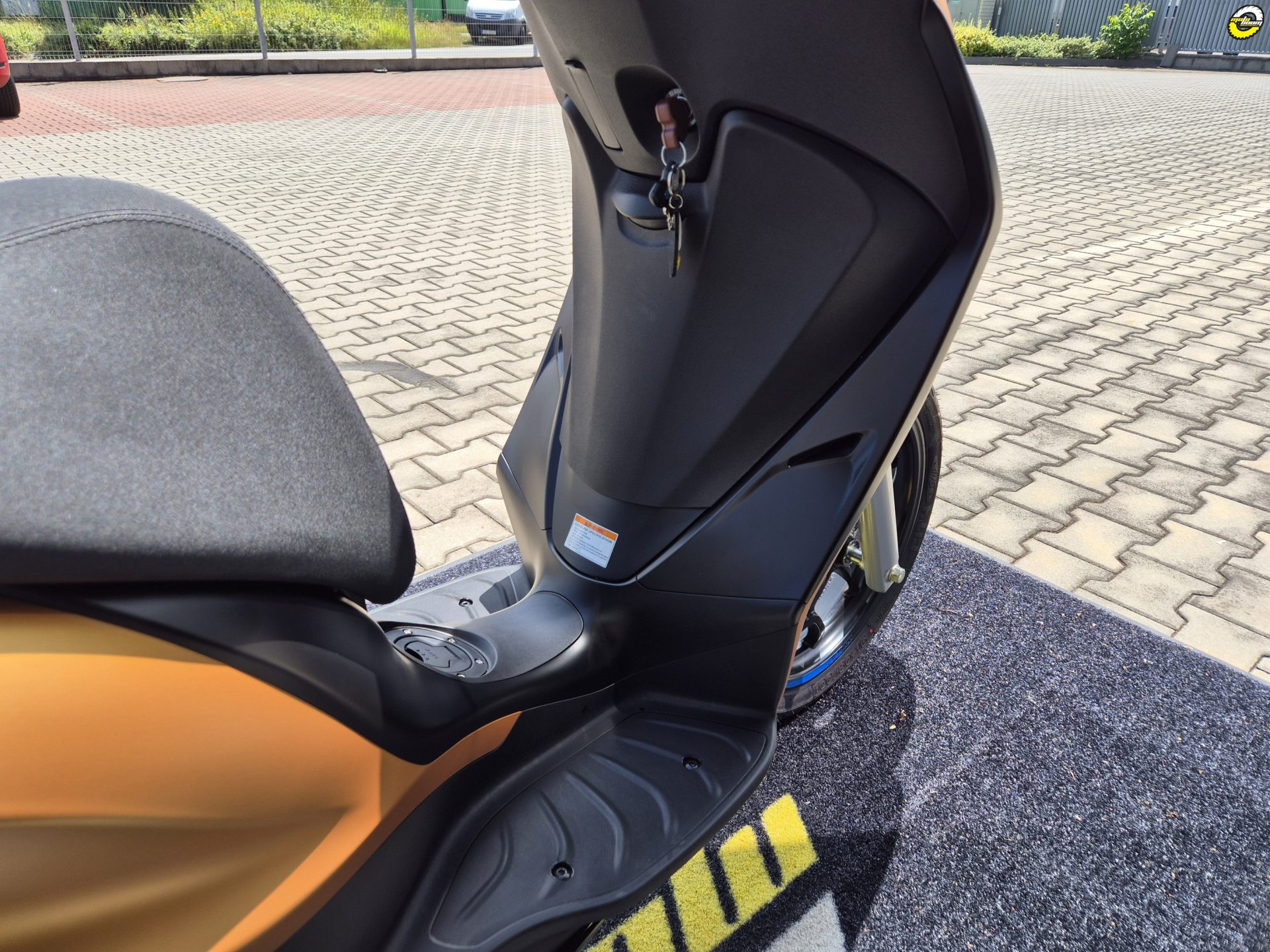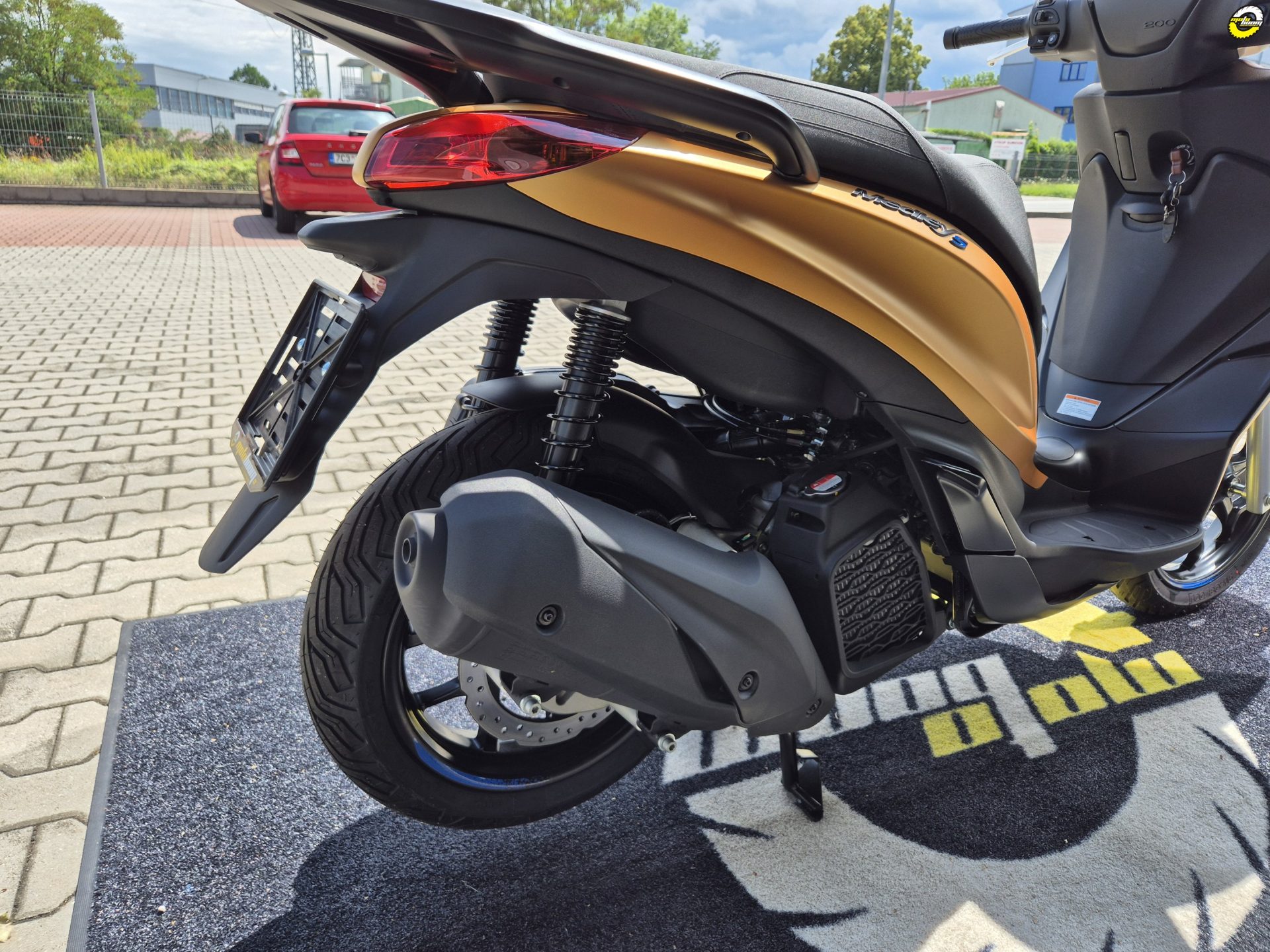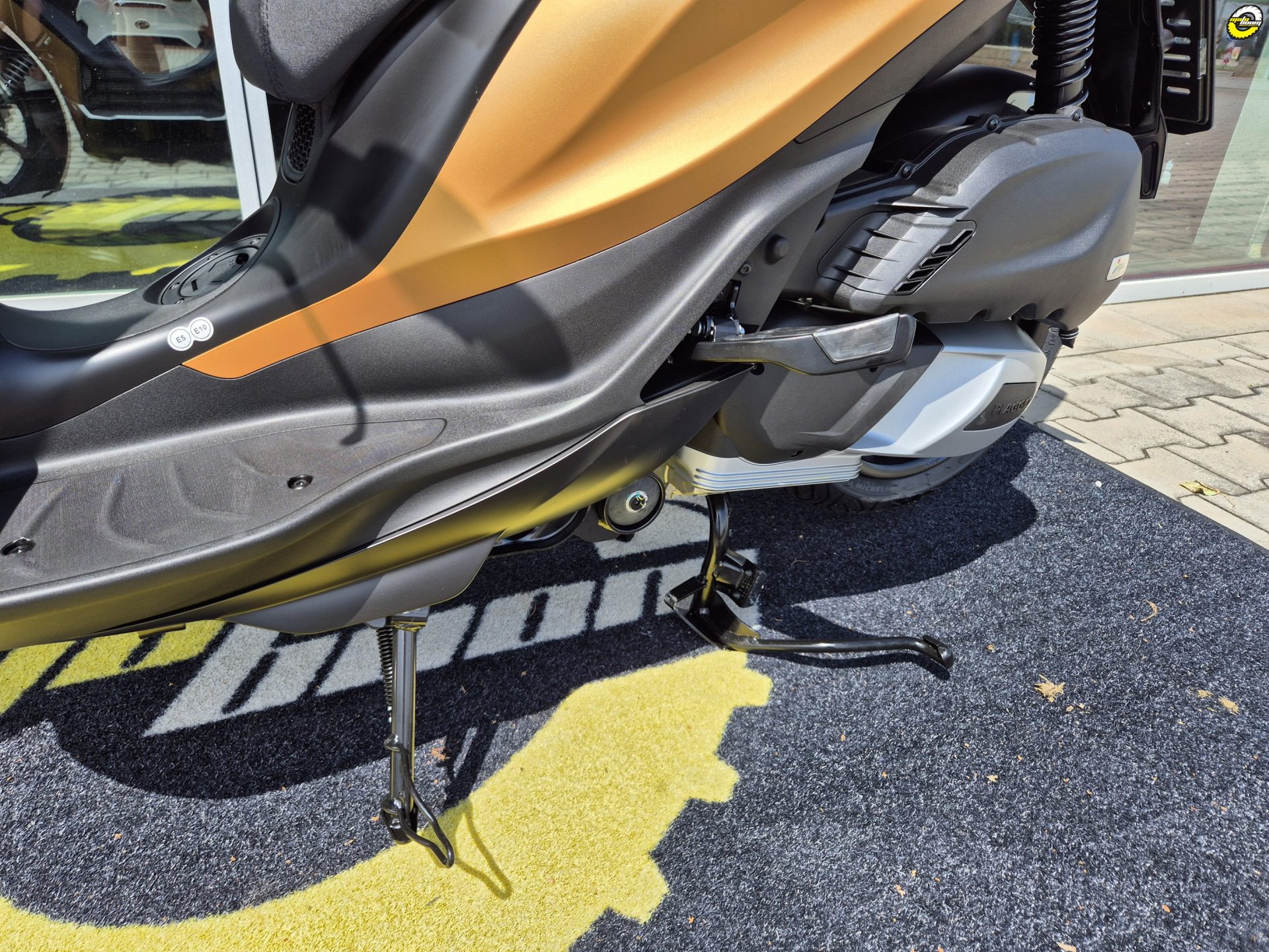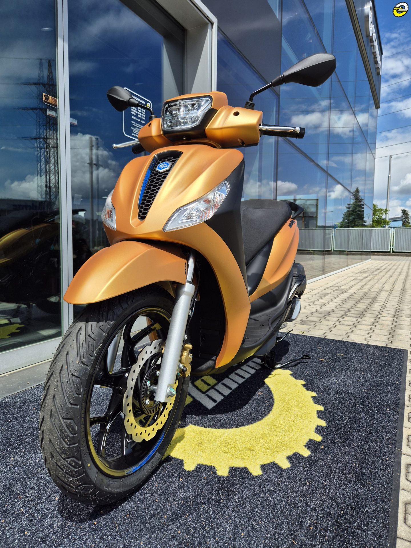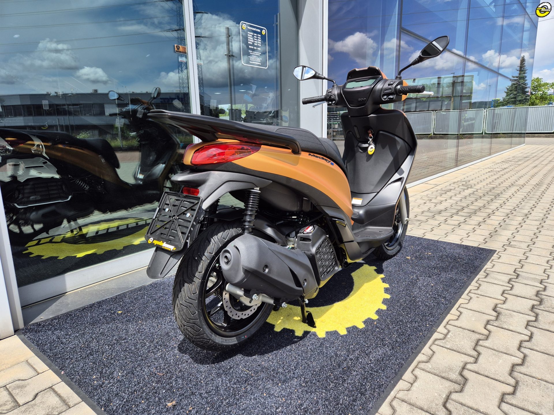 Sportovní charakter Piaggia Medley S ožívá v jeho nekompromisním a zároveň elegantním designu, který je ještě zvýrazněn temně černými detaily. Ty doplňují kontrastní modré nápisy na ráfcích kol a výrazná přední mřížka s designem včelího plastu. Sofistikovaná a zároveň ochranná přední část skůtru se dokonale doplňuje se štíhlými liniemi zadní části a vytváří vyváženou kombinaci sportovního charakteru a praktického vzhledu. Tmavé odstíny a matné barevné provedení ještě více zdůrazňují výrazný charakter Medley S - připraveného zapůsobit při každé jízdě.